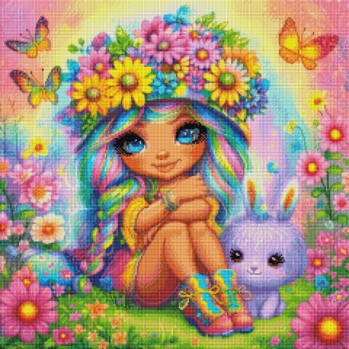 DIAPOP – Frühlingsblumenmädchen mit Zwergchen – 60x60cm – Eckige Harzsteine